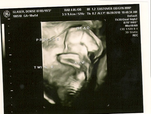 At 25 weeks they are measuring 23w3d (for A) and 23w 4d (for B) – at this point it’s hard to keep them straight – in other words, A & B might have flip-flopped between the last ultrasound and this one (most likely based on the measurements). A weighs in at 1.4 pounds and B at 1.6 pounds. Both have similar heartbeats (146 and 143 respectively) and are basically doing great. No concerns about placenta previa or anything. I did fail my glucose tolerance test (and rather spectacularly at that) so I have to do the 3 hour test when we return from DC.